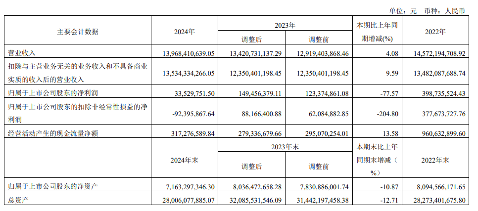 2024年,公司实现营业收入139.68亿元,同比增长4.08%;归属于上市公司股东的净利润3352.98万元,同比下滑77.57%;归属于上市公司股东的扣非净利润-9239.59万元,同比下滑204.80%;经营活动产生的现金流量净额为3.17亿元。
