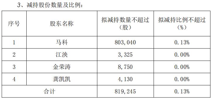 其中,马科拟减持数量不超过803,040股、江泱拟减持数量不超过3,325股、金荣涛拟减持数量不超过8,750股、龚凯凯拟减持数量不超过4,130股。